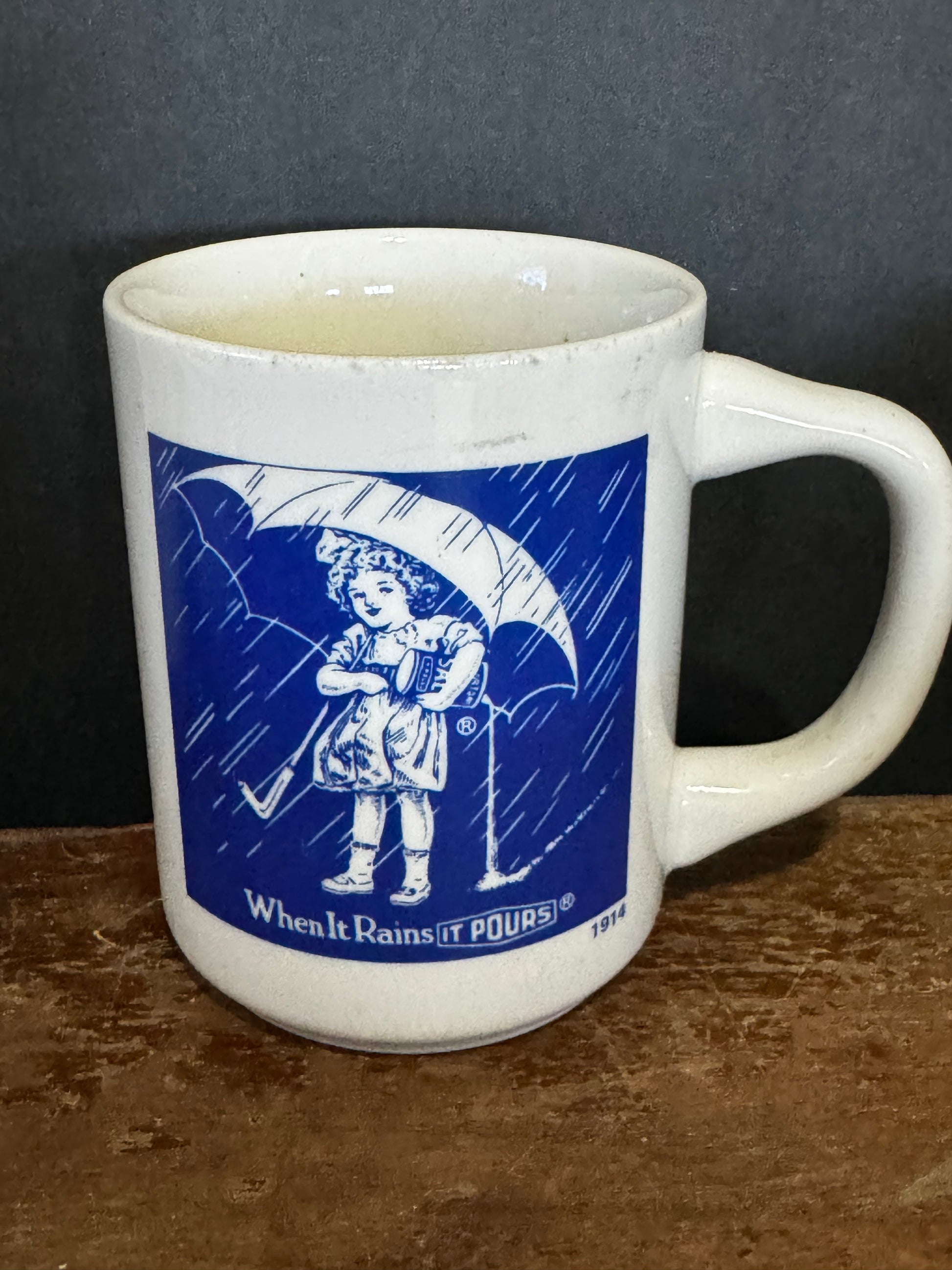 Vintage 1914Morton Salt Company Mug hold about 12 ounces. "When it Rains it Pours"