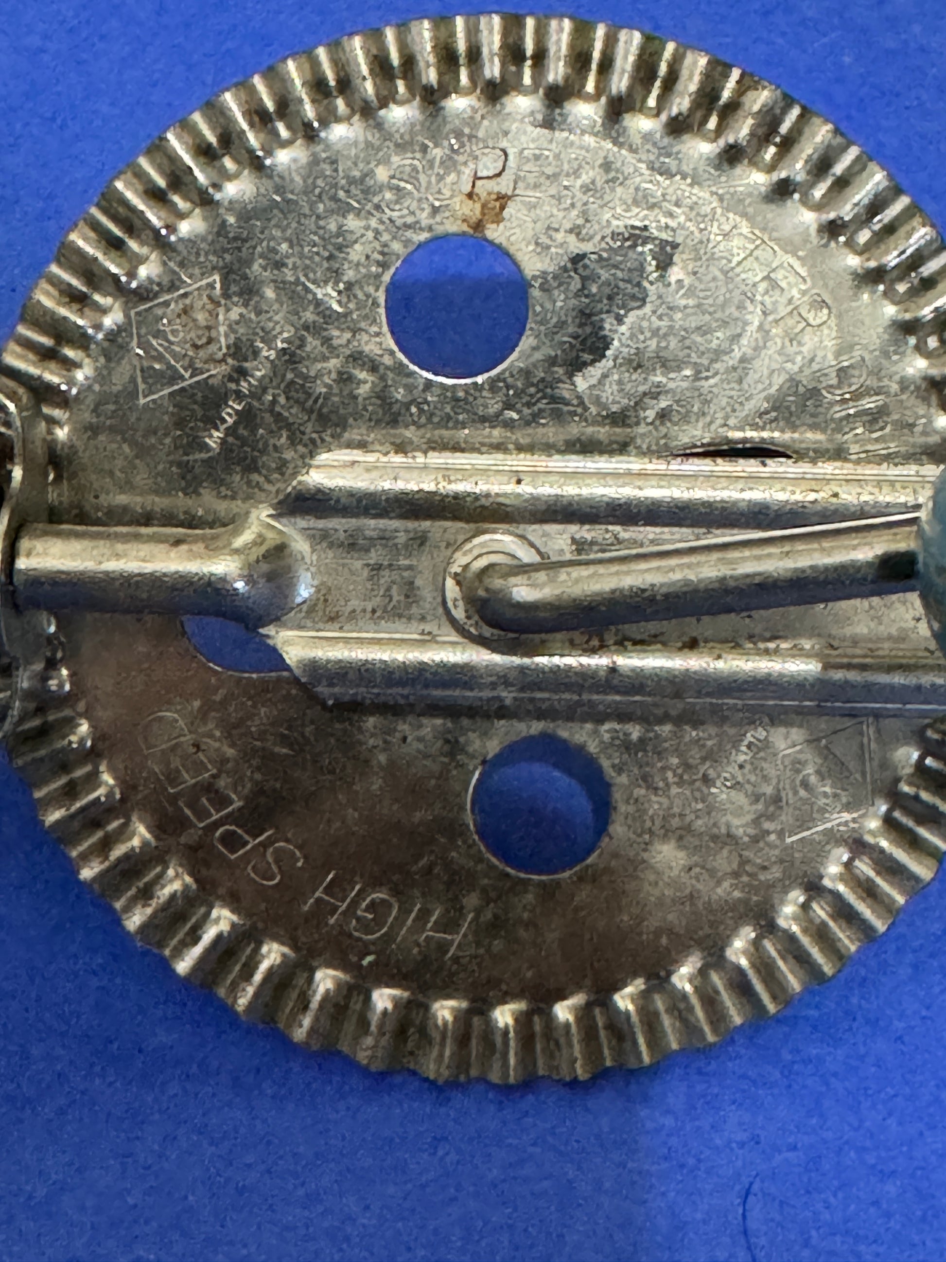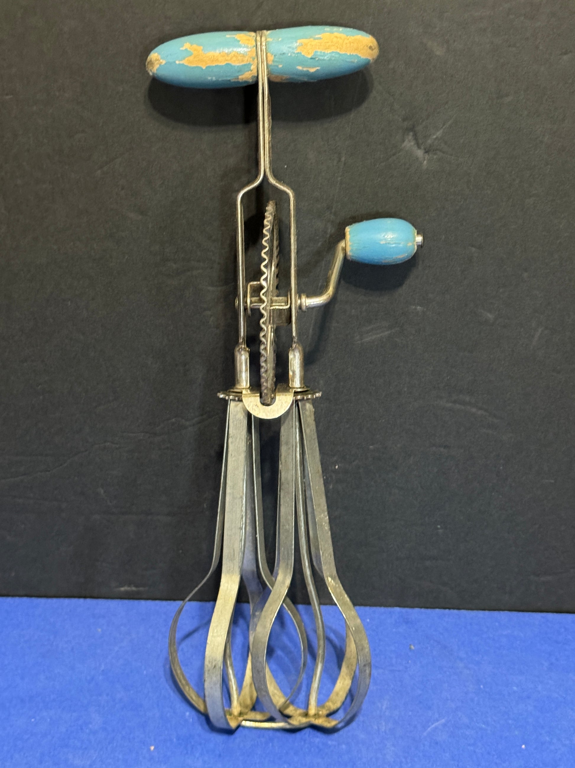 Hand Mixer Egg Beater Blue Wooden Handle USA - Vintage
