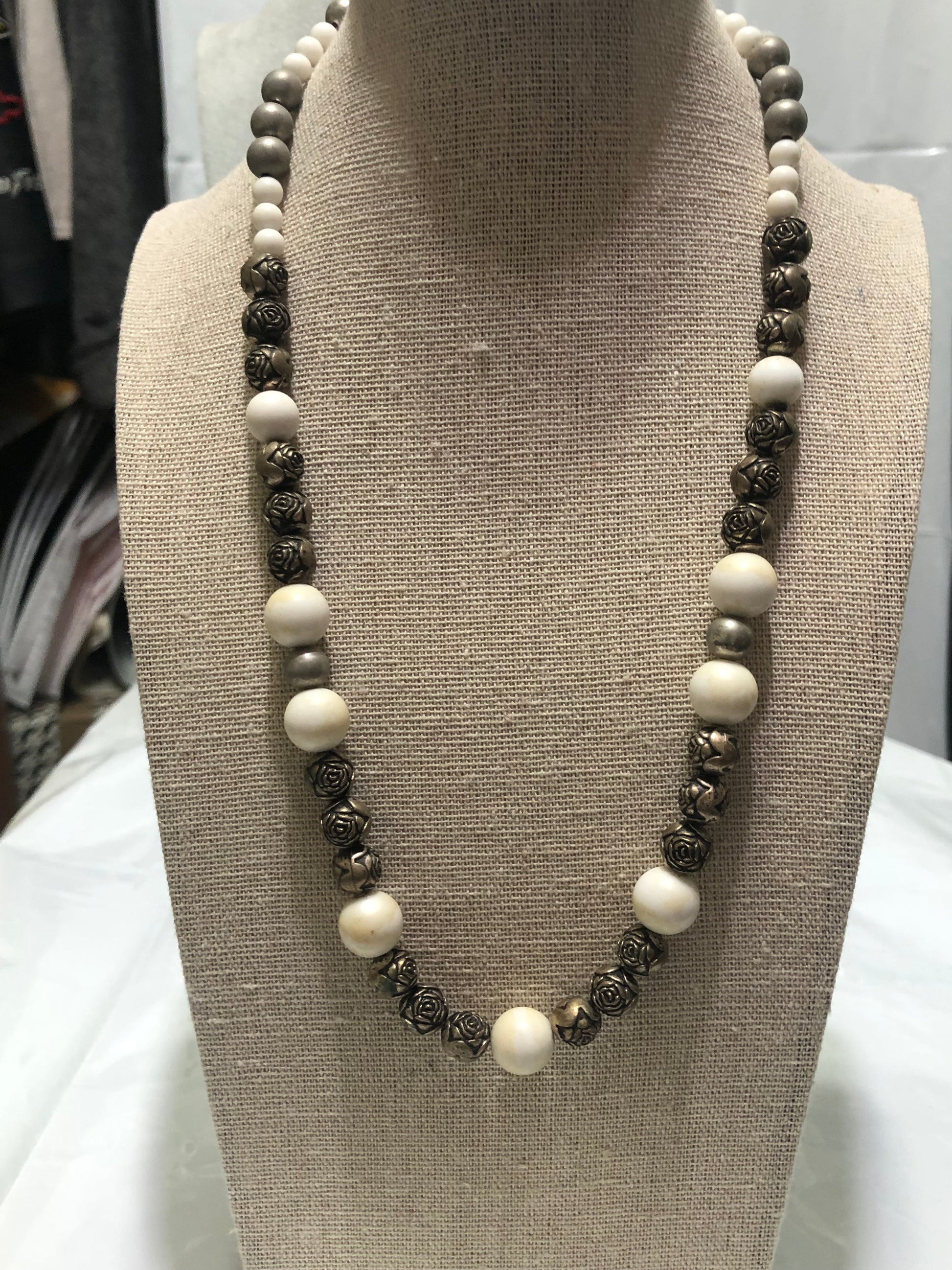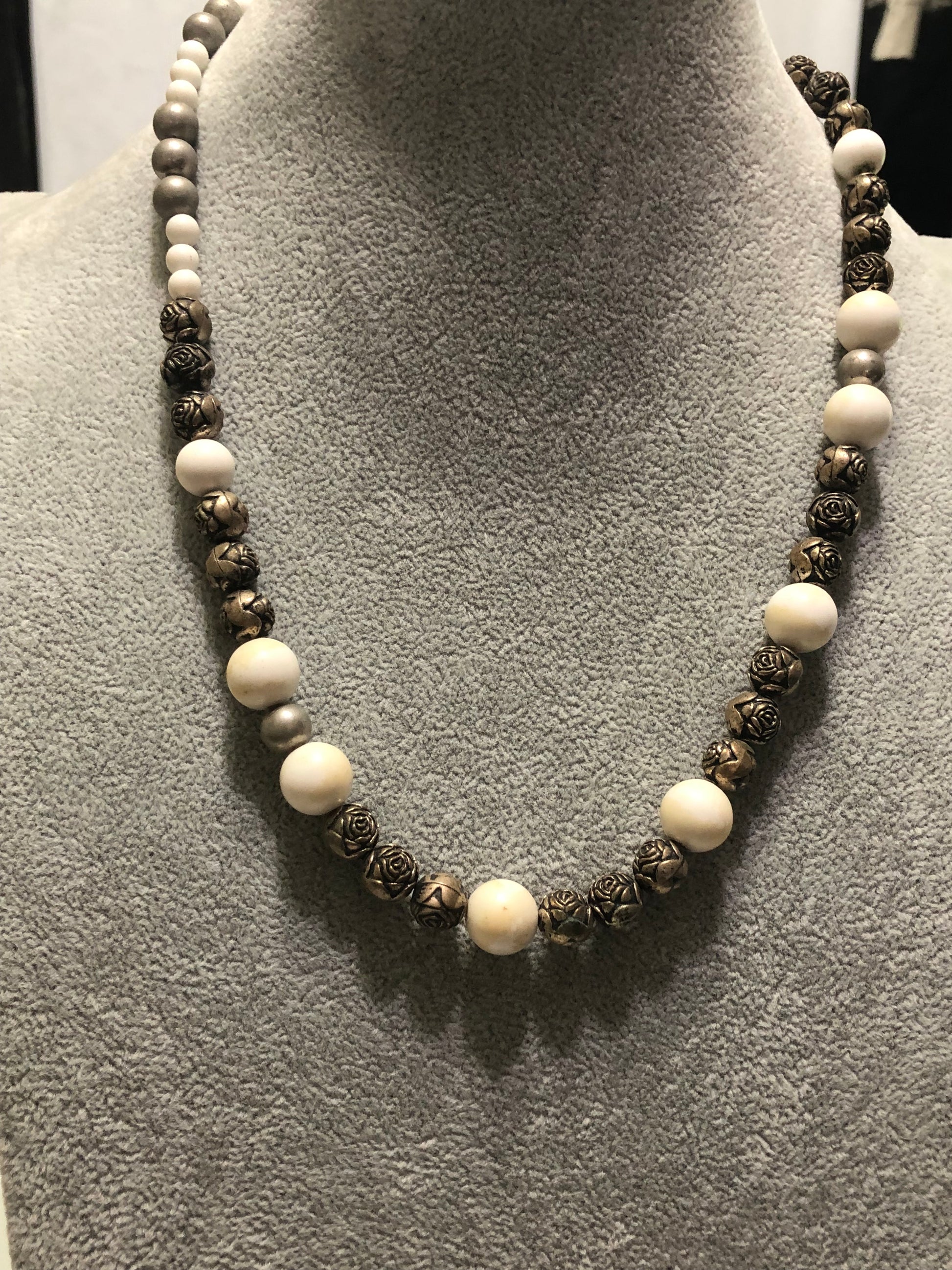 Magnesite and Antique Gold Metal Rose Beaded Necklace. 20"